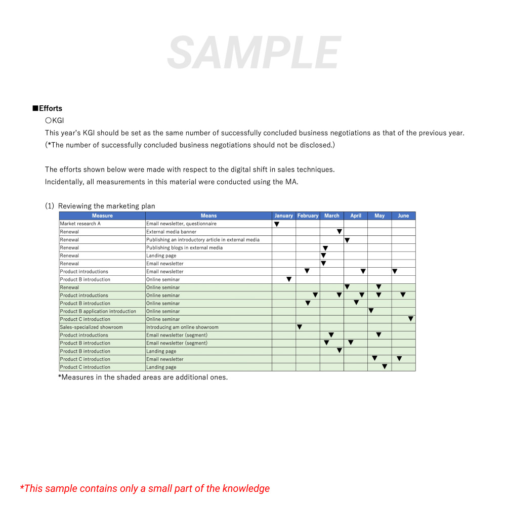 This know-how introduces endeavors that marketing/sales promotion representatives who have the same problems with you have made, and results they have achieved. This means ideas you can get from websites, such as how to increase the email click rate, are not included. What we introduce here includes results gained through exploring what measures to take when working backward from negotiating an order. There are no correct answers in marketing. But the know-how we introduce here will benefit you greatly.